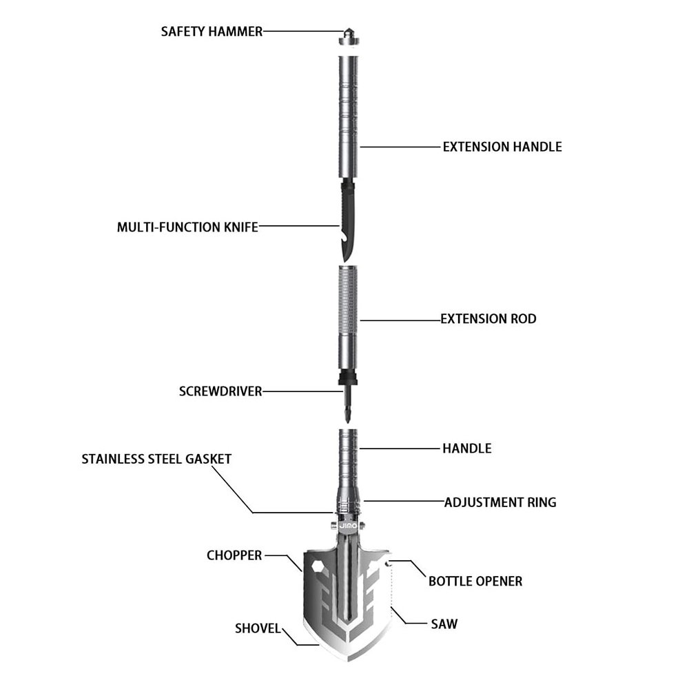- Functions: Shovel, pick, saw edge, bottle opener